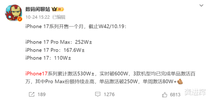 据知名数码博主“数码闲聊站”爆料,iPhone 17系列上市1个月,即截至10月19日,累计激活530万±,实时破600万。其中,iPhone 17 110万±,iPhone 17 Pro 167.6万±,iPhone 17 Pro Max 252万±。显然,这无疑是个非常炸裂的成绩,有些国产安卓旗舰一年也卖不了这么多,而苹果只用了短短一个月便达成。